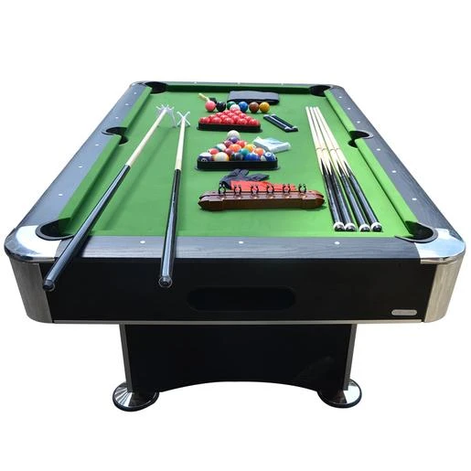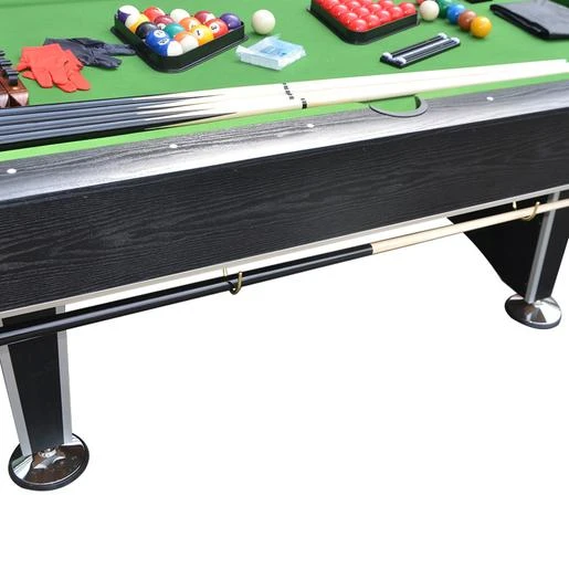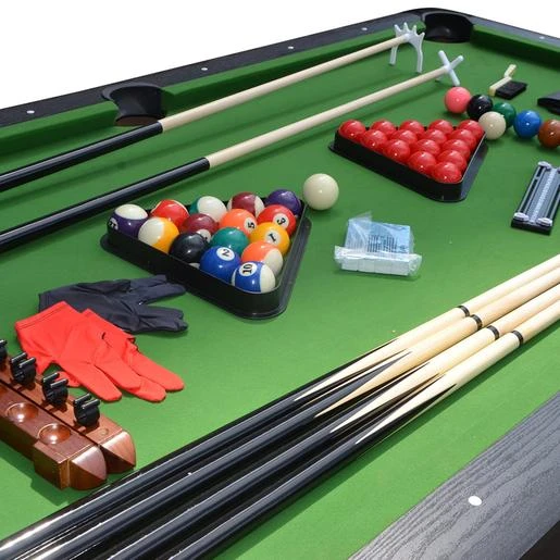 - Accesorios incluidos: bola de billar, triángulo para snooker, triángulo, 4 tacos 57”, 2 sticks, 6 orificios raqueta, tapa de color verde, 2 guantes negros, 2 guantes rojos, una caja de tizas con 20 piezas, 1 cepillo, 1 marcador, 1 funda.