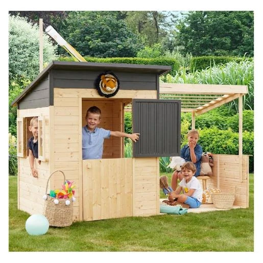 Esta casa infantil de madera cómoda y funcional atraerá a los niños con su gran abertura lateral que les permitirá acceder directamente a la pérgola adjunta. Para que puedan jugar dentro de la cabaña o afuera mientras disfrutan del aire fresco en el jardín.