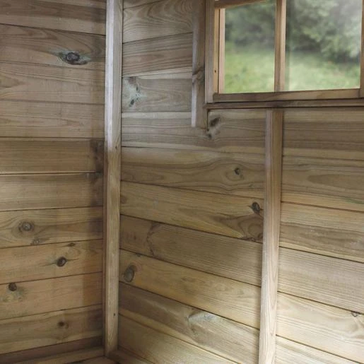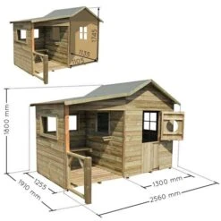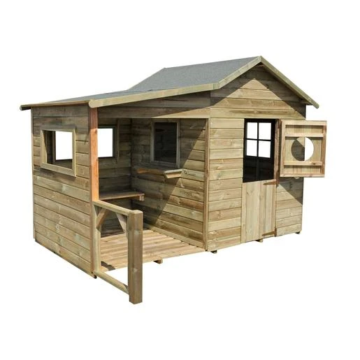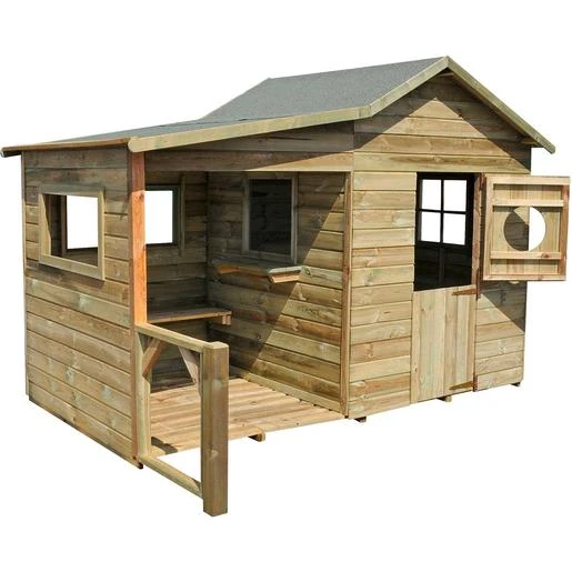 Tratada en autoclave clase III, la casita infantil de madera Hacienda es muy resistente a la intemperie ya la putrefacción. Además es ecológico ya que la madera utilizada para su construcción proviene de bosques gestionados de forma responsable. El suelo incluido es muy importante para aislar la casita Hacienda de la humedad del suelo mientras que el fieltro bituminoso del tejado la protegerá perfectamente de las lluvias. En bruto, la madera se puede teñir o pintar del color que elijas para crear una casa única y encantadora.