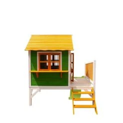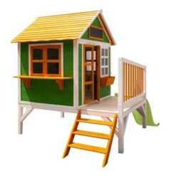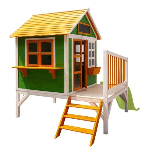 Casita elevada de madera Flam. La Casita Flam Elevada ofrece doble diversión, ya que los niños podrán jugar en la casita pero también podrán subir por las escaleras, jugar en la plataforma y bajar deslizándose por el tobogán.
