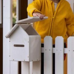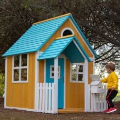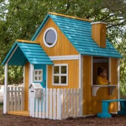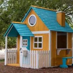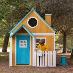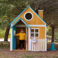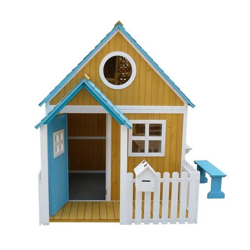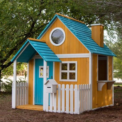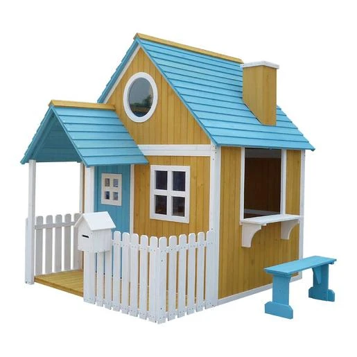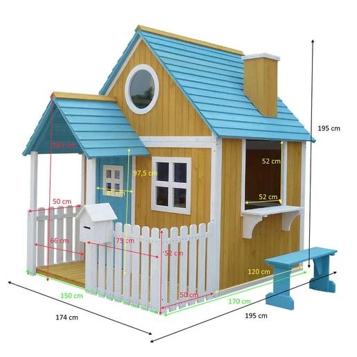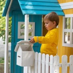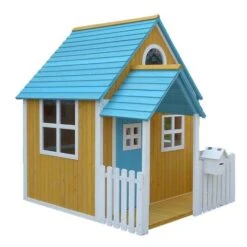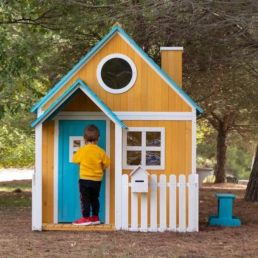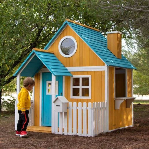 Casita madera Olden. La casita Olden es de un tamaño mediano, apta para cualquier jardín o patio particular. La casita Olden tiene muchos detalles que darán vida a esta casa. Desde su porche con tejado hasta la valla de color blanco o el buzón. Además incluye un banco de madera pintado en el mismo tono de azul que puedes dejar dentro o fuera de la casita para que los niños se puedan sentar y explicarse sus aventuras. También tiene una chimenea que le dará un toque más rústico a la casita.