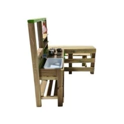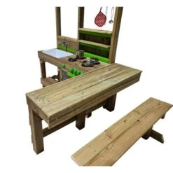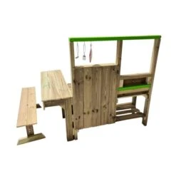 Cocina de madera de exterior Tasty Delicious. La cocina infantil de exterior Tasty Delicious es un juguete fabricado con madera de Flandes de calidad y muy resistente, apto para uso privado y comercial. Este modelo incluye mesa adosada a la cocina y banco para que los niños se puedan sentar.