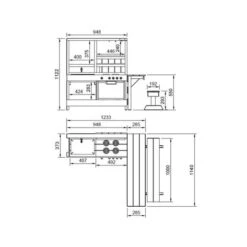 Medidas cocina: 948 mm largo x 388 mm ancho x 1122 mm alto. Medidas mesa y banco: 1140 mm largo x 285 mm ancho x 550 mm alto.