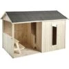 La estructura Karai Junior de la marca Masgames es un columpio de madera cuadrada apta para columpiarse niños/as de 3 a 12 años, con dos asientos de plástico para el jardín de una casa particular.