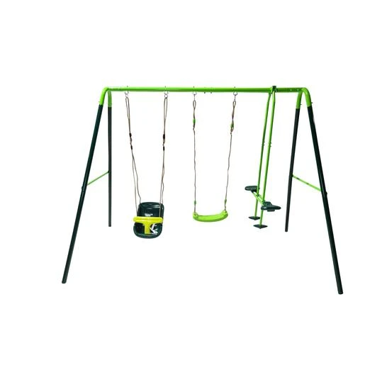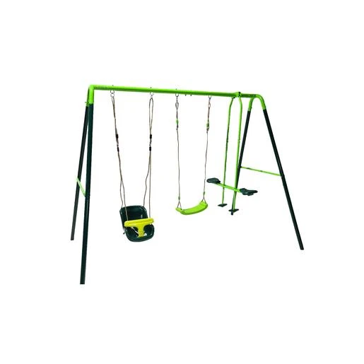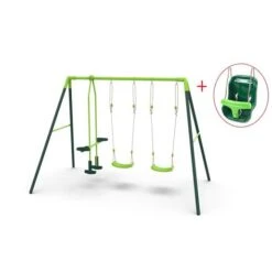 Columpio metálico triple Gingo + asiento bebé. Este columpio tiene dos asientos individuales y en un extremo un balancín cara a cara. Pueden sentarse hasta 4 niños a la vez en todo el columpio. Un columpio con estructura de metal galvanizado para exterior y pintado con tonos verdes para adaptarse mejor al jardín.