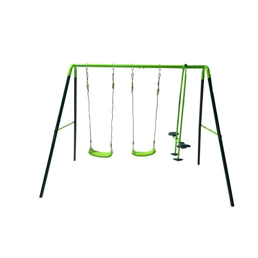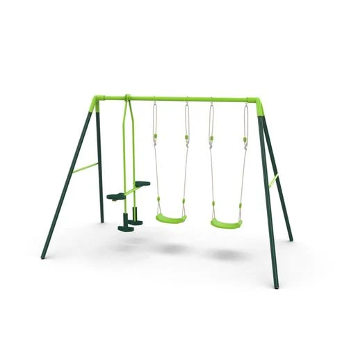 Columpio metálico triple Gingo. Este columpio tiene dos asientos individuales y en un extremo, un balancín cara a cara. Pueden sentarse hasta 4 niños a la vez en todo el columpio. Un columpio con estructura de metal galvanizado para exterior y pintado con tonos verdes para adaptarse mejor al jardín.