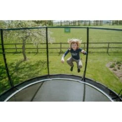 Gracias al sistema de protección para los pies (FPS) de Exit que interpone una red de protección entre la lona de salto y el acolchado del trampolín, los pies de la persona que está saltando nunca quedarán atrapados entre los muelles.
