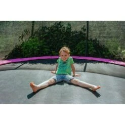 El trampolín Exit Silhouette de color rosa en el suelo con red de seguridad es un trampolín redondo de buena calidad.