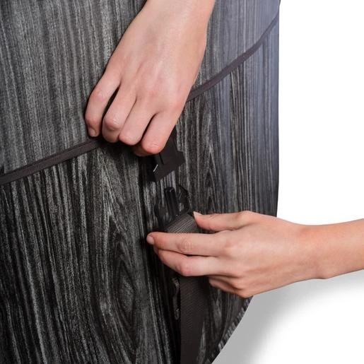 El exterior del spa EXIT Wood Deluxe es gris oscuro con un patrón de madera y el interior es gris claro. Tiene paredes extra resistentes hechas de pvc de triple capa y espuma en la parte inferior para permitir asientos extremadamente cómodos.
