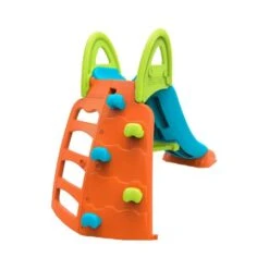 Un original tobogán con dos maneras de subir: unas escaleras clásicas anti-deslizantes y un pequeño rocódromo, con unas presas de escalada para ascender a lo alto del tobogán.