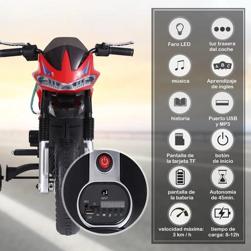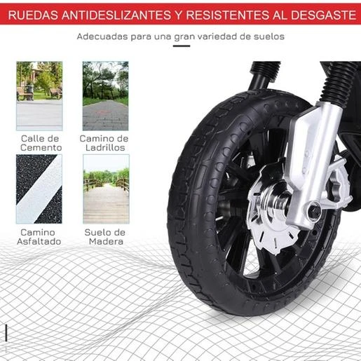 - Ruedas de plástico con un dibujo de la banda de rodadura para evitar que la motocicleta se deslice en la carretera y equipadas con 2 ruedas de entrenamiento para mayor seguridad.