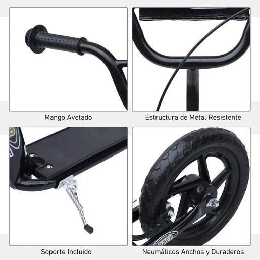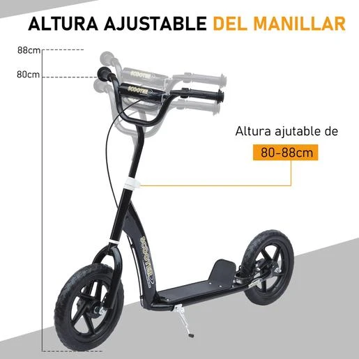 Homcom – Patinete Scooter Ajustable 2 ruedas Negro. ¿Quieres un regalo para que los niños se ejerciten a la vez que se diviertan? Este patinete de Homcom es la opción perfecta. Ideal para que se lo pasen en grande y quemen energía al mismo tiempo. Está hecho de acero muy resistente, y las ruedas de 12 pulgadas ofrecen una gran estabilidad. El manillar en forma de V tiene un freno justo al lado de uno de los mangos que inmovilizará la rueda posterior. Este patinete es apto para niños a partir de 5 años.