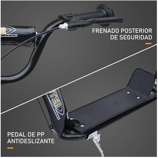 Hecho de acero es un patinete resistente y estable. Y cuenta con 2 ruedas grandes de EVA de 12 pulgadas, que proporcionan un desplazamiento suave y seguro. Tiene una base compuesta por una placa grande con superficie antideslizante, para mayor agarre de los pies y garantizar un deslizamiento seguro con el patinete.