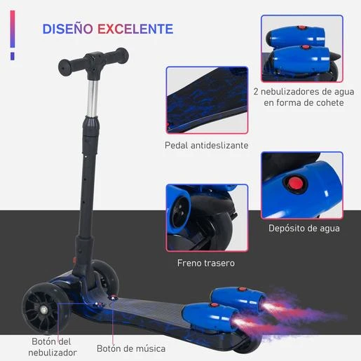 Este scooter es ideal para niños, con ruedas que hacen luz al rodar, música y 2 lanzadores de niebla de agua en forma de cohete en la parte posterior. Cuando tus hijos jueguen con él, sin duda atraerán la atención de los demás. Tus hijos estarán encantados con este scooter tan genial.