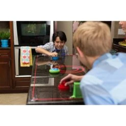 Hover Hockey – Mesa de Hockey Portátil, un playset que incluye 1 disco Hover Hockey, 2 mazos, 6.7 metros de cordón delimitador, 6 ventosas grandes para delimitar el área de juego, 4 ventosas pequeñas para colocar las porterías y 2 porterías. Hover Hockey es completamente portátil. ¡Puedes utilizarlo para jugar en casa, en un viaje, o incluso en tu fiesta de cumpleaños! ¡No gastes más tiempo y dinero en el salón recreativo! Asegura la cuerda que delimita el campo con las 6 ventosas de sujeción, coloca las porterías y ¡Listo! Ahora puedes convertir cualquier mesa en una mesa de hockey de aire, o incluso jugar en el suelo! El disco funciona con 2 pilas AAA (NO incluidas). Edad recomendada +6 años.
