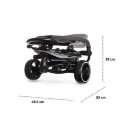 Peso 7.2 kg. Dimensiones después del plegado 47 x 54 x 42 cm. Asa de los padres 88-94 cm. Asiento altura desde el suelo 30 cm, ancho 22 cm, longitud 20 cm. Respaldo longitud 39 cm, ancho 29 cm. Reposapiés altura desde el suelo 13 cm.