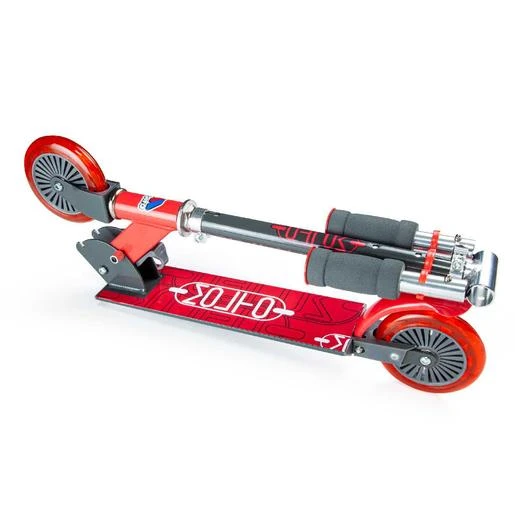 Patinete de color rojo para niñas y niños, fabricado en aluminio, plegable y con cierre de seguridad.