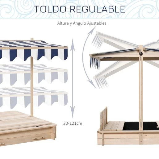 El arenero está hecho de madera de cedro y también tiene un toldo ajustable, para proteger a los niños del sol mientras se divierten. El toldo de este arenero infantil se puede regular en altura y en ángulo, para proteger a los más pequeños del sol mientras juegan.