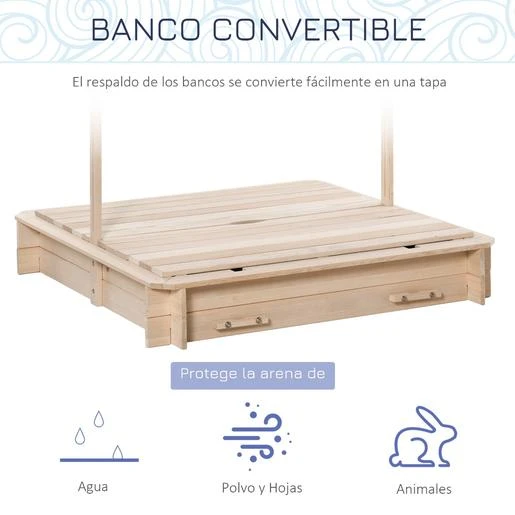 Outsunny – Arenero de madera. ¿A tus hijos les encanta jugar con arena? Entonces no te lo pienses más; este arenero con toldo de Outsunny es ideal para ellos. Además, cuenta con cómodos bancos en dos de los 2 lados, y pueden utilizarse también para tapar el arenero cuando no esté en uso, protegiendo así la arena de los escombros y la intemperie.