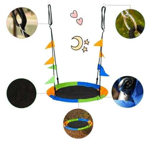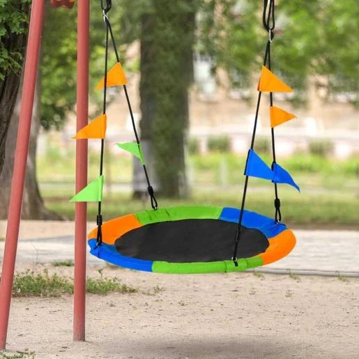 - Columpio nido de gran colorido, con banderolas decorativas.