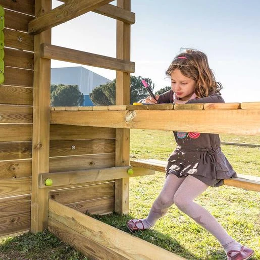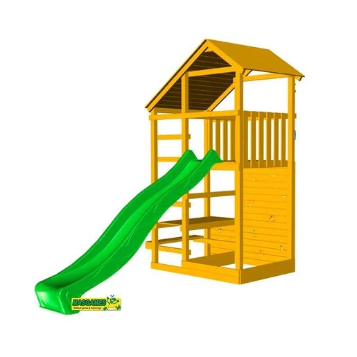 Parque juegos infantil de madera Teide XL. El parque infantil Teide está compuesto de una casita de madera elevada, a la que se puede acceder por las escaleras o escalando por la pared del lateral. Para bajar de la torre de la casita infantil se utiliza la rampa del tobogán.