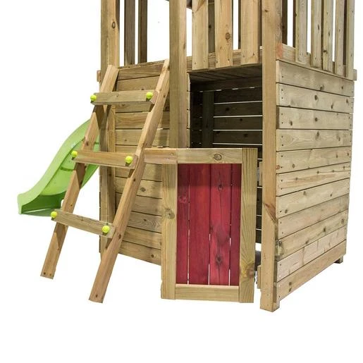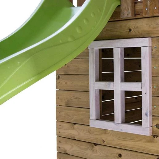 Parque juegos infantil de madera Tibidabo con casita. El Parque infantil Tibidabo con casita, es una torre de madera cuadrada fuerte y muy bonita para su jardín. Su estructura alberga una casita en toda la mitad inferior. La casita, cuyo techo es a la vez el piso de 120 cm de altura por el que bajar por el tobogán, es ideal para que los más pequeños se refugien, jueguen y sueñen con mil aventuras. También podrán guardar en ella sus juguetes. La casita cuenta con una puerta de media altura que, junto con la ventana que hay en uno de los laterales, permite la entrada de mucha luz para que los niños puedan jugar durante horas. Las maderas de la casita dan, a su vez, mucha resistencia y estabilidad al conjunto del parque.