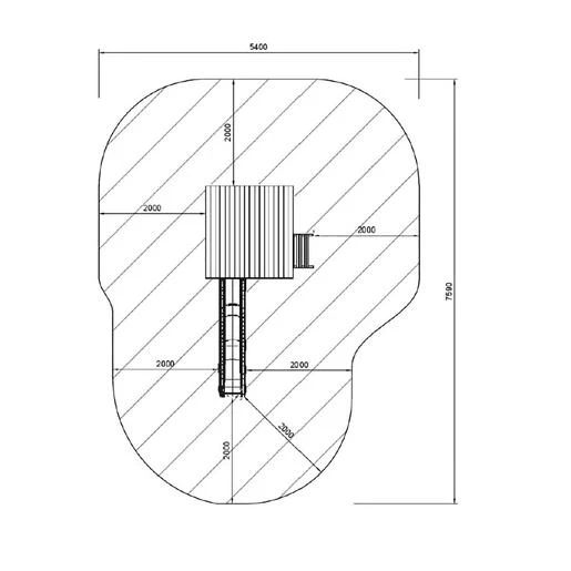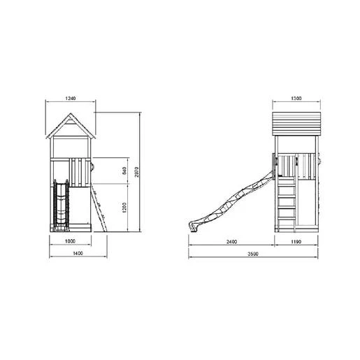 El acceso a la plataforma de la Torre Tibidabo es mediante una escalera de madera hasta el piso superior, a una altura de 120 cm. La plataforma, a esta altura, está protegida por los cuatro lados por la baranda de madera, por lo que queda muy protegida. Tiene aperturas solo en el acceso de la escalera y la salida del tobogán. La rampa de tobogán llevará a los niños a nivel del suelo, y volverá a empezar la aventura.