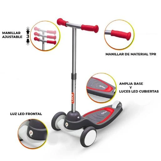 Patinete Mika rojo con luces LED, un divertido patinete que permite a los más pequeños ejercitar su cuerpo y adquirir muchas habilidades importantes para su desarrollo.