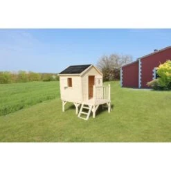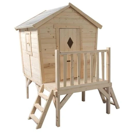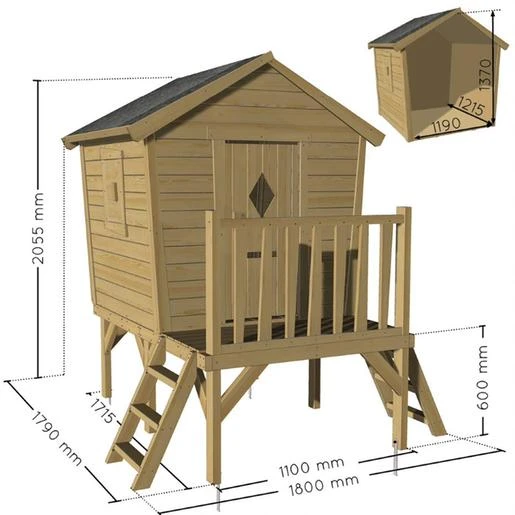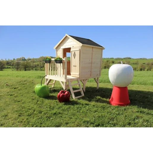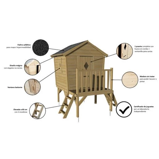 Esta casita elevada incluye los anclajes para el suelo. Al ser una casita elevada, cuenta con 2 escaleras para acceder a ella y un balcón.