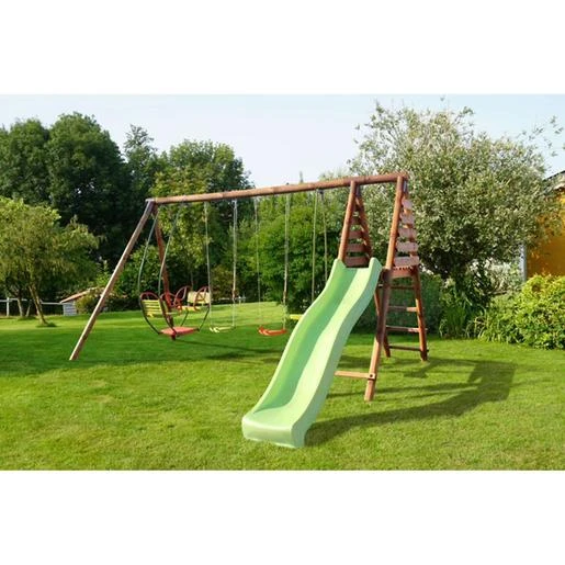 Se trata de un columpio de madera tratada con autoclave IV marrón. Es ideal para una casa con jardín, y para peques de 3 a 12 años.