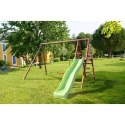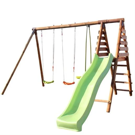 Se trata de un columpio de madera tratada con autoclave IV marrón. Es ideal para una casa con jardín, y para peques de 3 a 12 años.