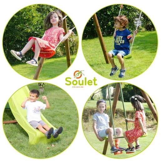 Incluye anclajes para el suelo, 2 asientos individuales, 1 frente a frente, 1 tobogán, protección antipellizcos y anillas reforzadas.