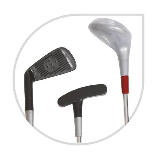 Este set incluye 3 palos, 5 tees, 1 hoyo, 1 banderín, 3 bolas y 1 bloque marcador con lápiz.