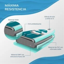 La superficie está fabricada con goma EVA antideslizante para aumentar la adherencia. Incluye una hebilla en forma de D con una correa para el tobillo para mayor seguridad, y viene con un compartimento de cuerda elástica de 3 m para mantener a salvo tus enseres personales.