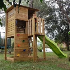 ¡Caseta de madera con terraza situada a 1,58 m de altura accesible gracias a una escalera protegida por una barandilla para poder vigilar a los barcos enemigos! ¡Accesorio con una bandera «pirata», un telescopio y un timón giratorio, esta torre de juegos de madera brindará a sus hijos un tiempo de juego memorable e interminable!